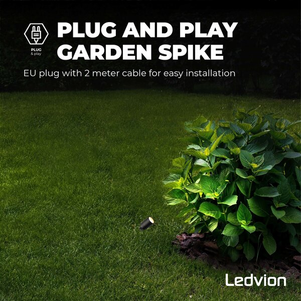 Der LED-Gartenstrahler wird inklusive einer Ledvion GU10-Lampe geliefert. Die Ledvion Lampe erzeugt Licht im Wert von 345 Lumen. Mit einem Wattageverbrauch von nur 3W bedeutet das 115 Lumen pro Watt.